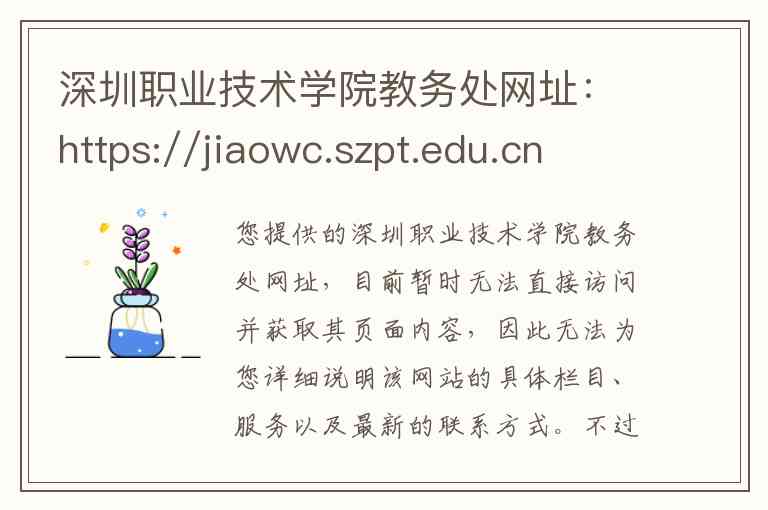 您提供的深圳职业技术学院教务处网址,目前暂时无法直接访问并获取其页面内容,因此无法为您详细说明该网站的具体栏目、服务以及最新的联系方式。