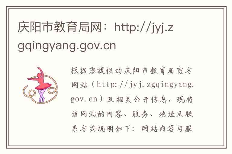 根据您提供的庆阳市教育局官方网站(http://jyj.zgqingyang.gov.cn)及相关公开信息,现将该网站的内容、服务、地址及联系方式说明如下: