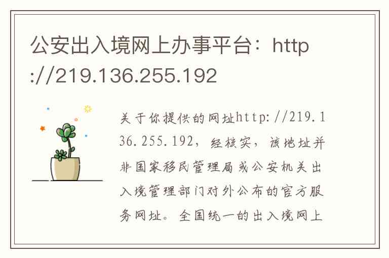 关于你提供的网址http://219.136.255.192,经核实,该地址并非国家移民管理局或公安机关出入境管理部门对外公布的官方服务网址。全国统一的出入境网上办事平台官方入口为国家移民管理局政务服务平台,官方网址是http://s.nia.gov.cn 或 http://www.nia.gov.cn-4。建议你通过官方渠道办理业务,以确保信息安全。