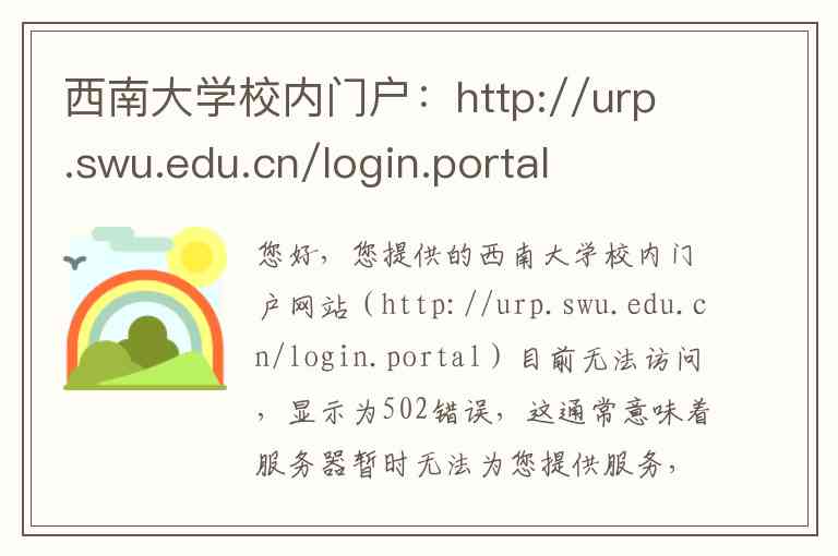 您好,您提供的西南大学校内门户网站(http://urp.swu.edu.cn/login.portal)目前无法访问,显示为502错误,这通常意味着服务器暂时无法为您提供服务,可能是系统维护或网络波动导致的,建议您稍后再试。