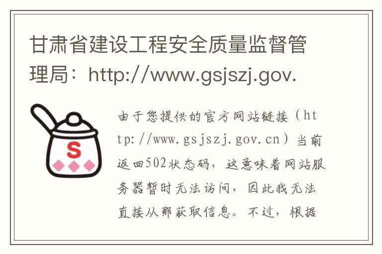 由于您提供的官方网站链接(http://www.gsjszj.gov.cn)当前返回502状态码,这意味着网站服务器暂时无法访问,因此我无法直接从那获取信息。不过,根据公开的权威资料,我为您整理了甘肃省建设工程安全质量监督管理局的详细介绍。