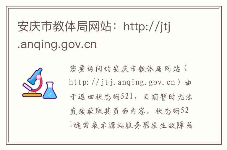 您要访问的安庆市教体局网站(http://jtj.anqing.gov.cn)由于返回状态码521,目前暂时无法直接获取其页面内容。状态码521通常表示源站服务器发生故障或暂时无法响应,可能是由于网站维护、服务器过载或网络问题导致。