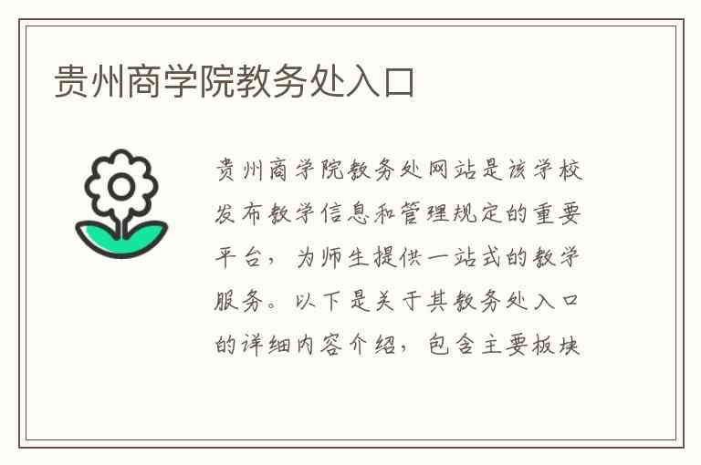 贵州商学院教务处网站是该学校发布教学信息和管理规定的重要平台,为师生提供一站式的教学服务。以下是关于其教务处入口的详细内容介绍,包含主要板块、服务功能以及详细的地址和联系方式。