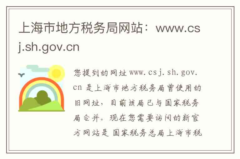 您提到的网址 www.csj.sh.gov.cn 是上海市地方税务局曾使用的旧网址,目前该局已与国家税务局合并。现在您需要访问的新官方网站是 国家税务总局上海市税务局,其官方网址为 shanghai.chinatax.gov.cn -1。以下是关于该网站提供的具体内容、服务以及详细的官方联系方式的说明。