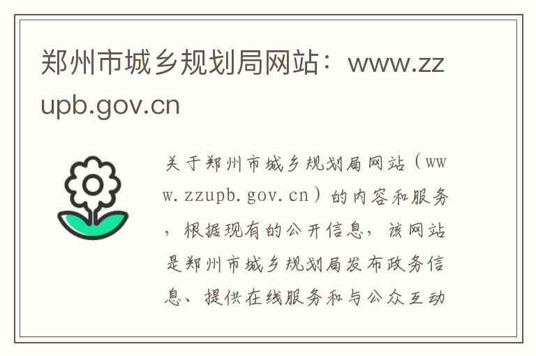 关于郑州市城乡规划局网站(www.zzupb.gov.cn)的内容和服务,根据现有的公开信息,该网站是郑州市城乡规划局发布政务信息、提供在线服务和与公众互动交流的主要官方网络平台。需要首先说明的是,在后续的机构改革中,郑州市城乡规划局的职责已整合进郑州市自然资源和规划局,但该网站的历史内容和信息仍能反映其当时的职能与服务-4。