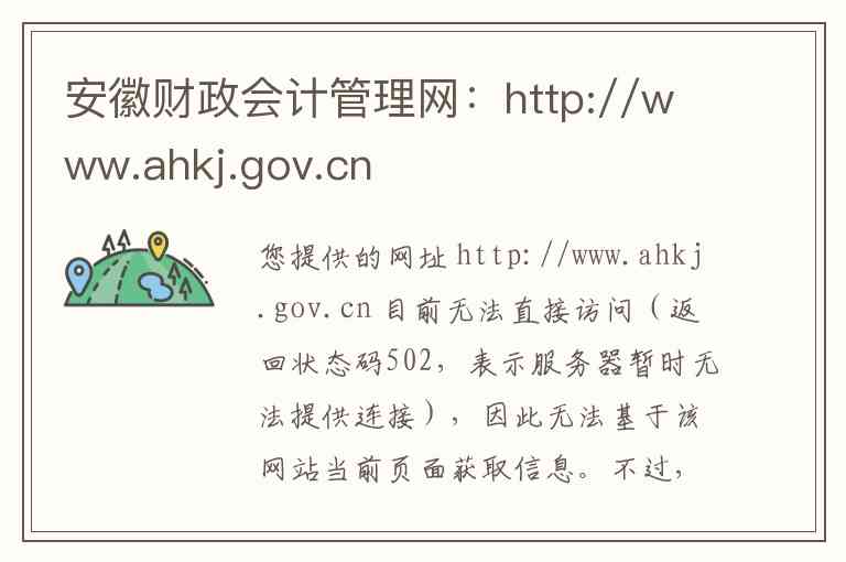 您提供的网址 http://www.ahkj.gov.cn 目前无法直接访问(返回状态码502,表示服务器暂时无法提供连接),因此无法基于该网站当前页面获取信息。不过,根据公开的搜索结果,可以为您详细介绍原“安徽会计管理网”(通常指该域名对应的网站)的主要内容和服务,以及安徽省会计管理的官方联系方式和入口。