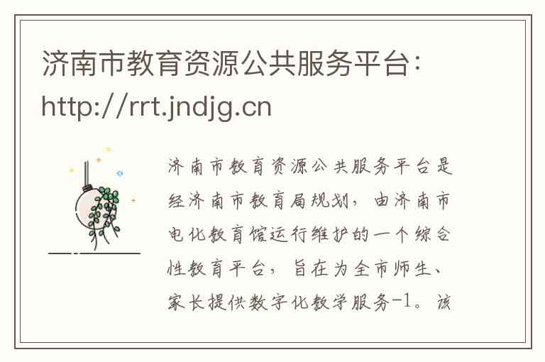济南市教育资源公共服务平台是经济南市教育局规划,由济南市电化教育馆运行维护的一个综合性教育平台,旨在为全市师生、家长提供数字化教学服务-1。该平台的上线时间为2018年9月,目前已开通超过319万个网络学习空间,覆盖了从小学到高中的各个学段-1。
