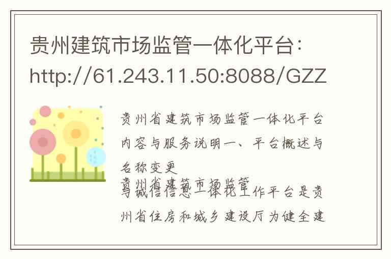 您提供的访问地址http://61.243.11.50:8088/GZZHXT/Index.html 是平台的入口之一根据官方公告平台的另一访问地址为http://jzjg.gzjs.gov.cn:8088/gzzhxt/ 用户还可登录贵州省住房和城乡建设厅门户网站主页点击右上角贵州省建筑市场监管公共服务平台图片进入-1