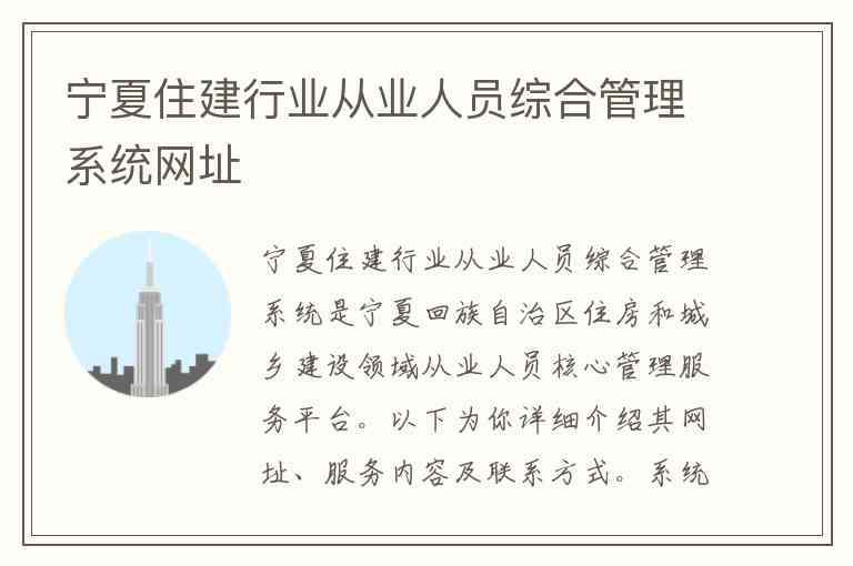 宁夏住建行业从业人员综合管理系统是宁夏回族自治区住房和城乡建设领域从业人员核心管理服务平台。以下为你详细介绍其网址、服务内容及联系方式。