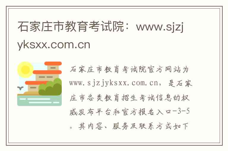 石家庄市教育考试院官方网站为www.sjzjyksxx.com.cn,是石家庄市各类教育招生考试信息的权威发布平台和官方报名入口-3-5。其内容、服务及联系方式如下: