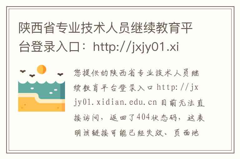 您提供的陕西省专业技术人员继续教育平台登录入口 http://jxjy01.xidian.edu.cn 目前无法直接访问,返回了404状态码,这表明该链接可能已经失效、页面地址发生变更或临时出现技术故障。