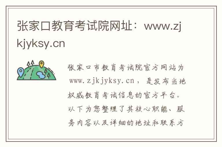 张家口市教育考试院官方网站为 www.zjkjyksy.cn ,是发布当地权威教育考试信息的官方平台。以下为您整理了其核心职能、服务内容以及详细的地址和联系方式。