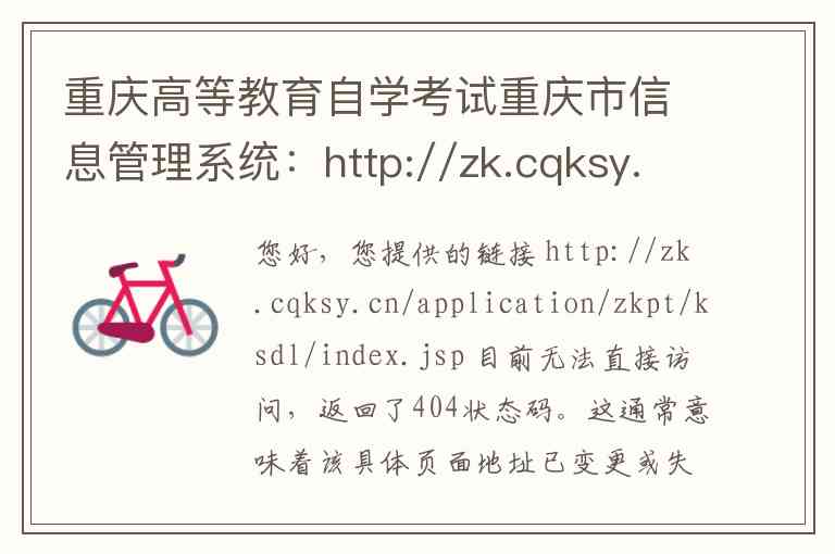 您好,您提供的链接 http://zk.cqksy.cn/application/zkpt/ksdl/index.jsp 目前无法直接访问,返回了404状态码。这通常意味着该具体页面地址已变更或失效。