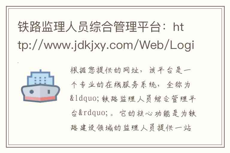 根据您提供的网址,该平台是一个专业的在线服务系统,全称为“铁路监理人员综合管理平台”。它的核心功能是为铁路建设领域的监理人员提供一站式的线上服务,目前主要聚焦于业务培训和继续教育的报名与管理。