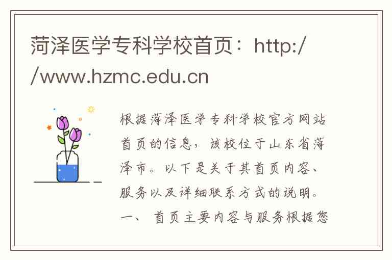 根据菏泽医学专科学校官方网站首页的信息,该校位于山东省菏泽市。以下是关于其首页内容、服务以及详细联系方式的说明。