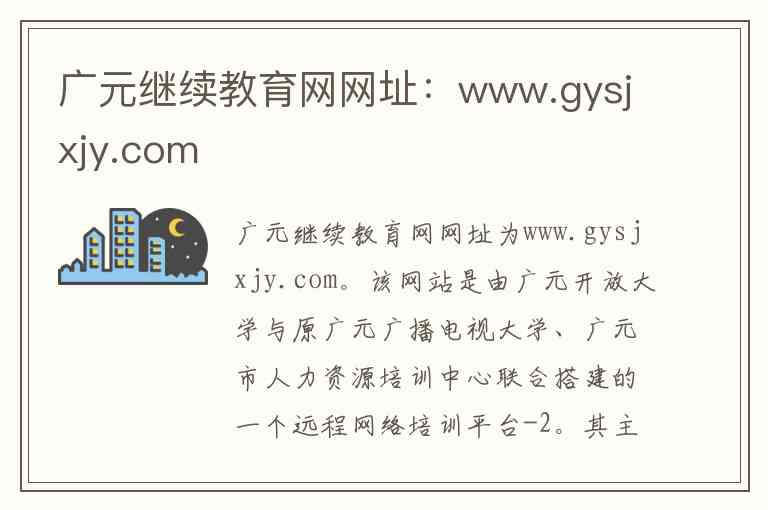 广元继续教育网网址为www.gysjxjy.com。该网站是由广元开放大学与原广元广播电视大学、广元市人力资源培训中心联合搭建的一个远程网络培训平台-2。其主要目的是为了适应互联网时代的需求,改进培训方式,为广元市各类人员提供继续教育服务-2。
