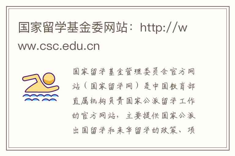 国家留学基金管理委员会官方网站(国家留学网)是中国教育部直属机构负责国家公派留学工作的官方网站,主要提供国家公派出国留学和来华留学的政策、项目、申请、管理及服务信息。