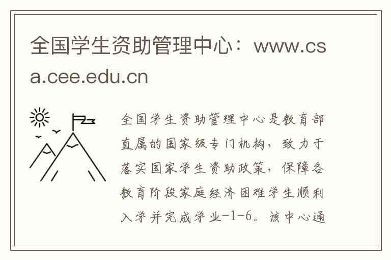 全国学生资助管理中心是教育部直属的国家级专门机构,致力于落实国家学生资助政策,保障各教育阶段家庭经济困难学生顺利入学并完成学业-1-6。该中心通过政策推动、资金管理、信息服务和宣传教育,确保不让一个学生因家庭经济困难而失学-8。
