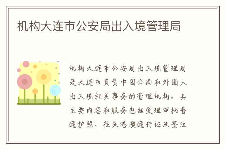 机构大连市公安局出入境管理局是大连市负责中国公民和外国人出入境相关事务的管理机构。其主要内容和服务包括受理审批普通护照、往来港澳通行证及签注、往来台湾通行证及签注,以及负责外国人的签证、居留许可等证件的申请办理-5-8。该局推行窗口智能化建设,提供自助照相机、24小时自助签注机、自助发证机等服务设备,方便市民快速办理业务-5-8。同时,为优化服务,该局实行工作日无午休及周六加班延时服务,并对老弱病残孕等特殊群体及紧急事由申请人开辟绿色通道-4-5-8。