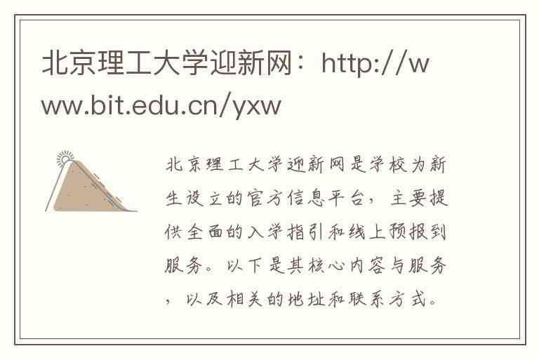 北京理工大学迎新网是学校为新生设立的官方信息平台,主要提供全面的入学指引和线上预报到服务。以下是其核心内容与服务,以及相关的地址和联系方式。