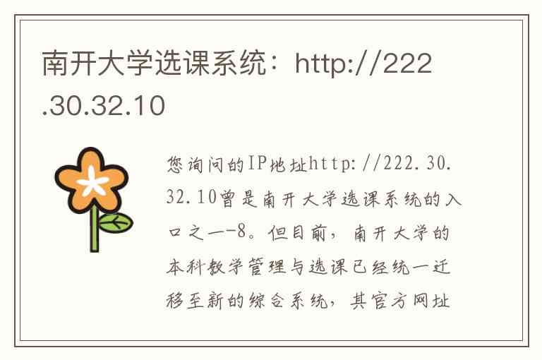您询问的IP地址http://222.30.32.10曾是南开大学选课系统的入口之一-8。但目前,南开大学的本科教学管理与选课已经统一迁移至新的综合系统,其官方网址为:https://eamis.nankai.edu.cn -1-3-4。