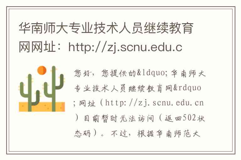 您好,您提供的“华南师大专业技术人员继续教育网”网址(http://zj.scnu.edu.cn)目前暂时无法访问(返回502状态码)。不过,根据华南师范大学官方发布的信息和相关资料,我为您整理了关于该平台的详细介绍、服务内容及联系方式,供您参考。