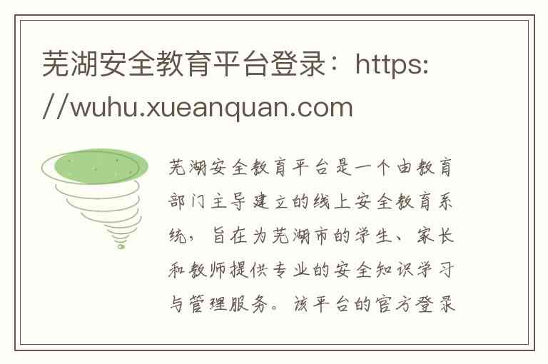 芜湖安全教育平台是一个由教育部门主导建立的线上安全教育系统,旨在为芜湖市的学生、家长和教师提供专业的安全知识学习与管理服务。该平台的官方登录网址是:https://wuhu.xueanquan.com -4-5。