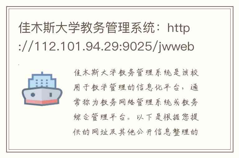 佳木斯大学教务管理系统是该校用于教学管理的信息化平台,通常称为教务网络管理系统或教务综合管理平台。以下是根据您提供的网址及其他公开信息整理的系统介绍、服务内容及相关联系方式。