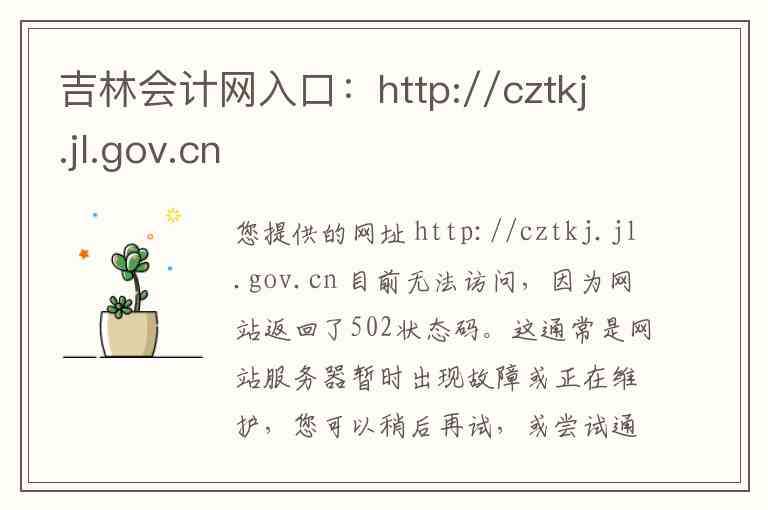 您提供的网址 http://cztkj.jl.gov.cn 目前无法访问,因为网站返回了502状态码。这通常是网站服务器暂时出现故障或正在维护,您可以稍后再试,或尝试通过搜索引挚查找“吉林省财政厅官网”进入。