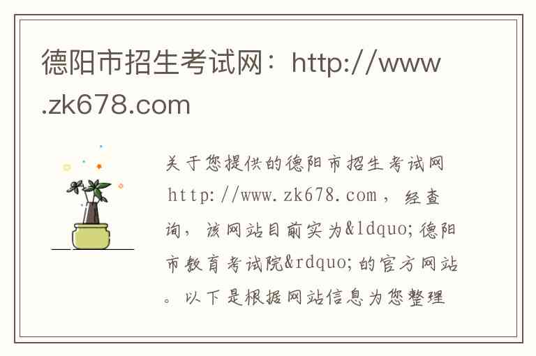 关于您提供的德阳市招生考试网 http://www.zk678.com ,经查询,该网站目前实为“德阳市教育考试院”的官方网站。以下是根据网站信息为您整理的具体内容、服务及联系方式,所有信息均为纯文字格式。
