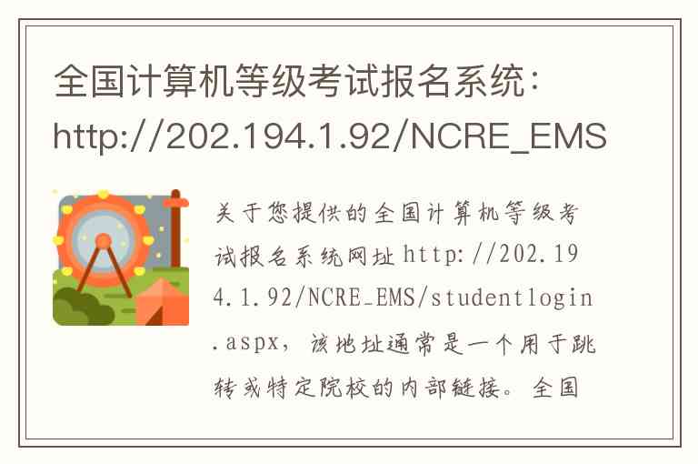 关于您提供的全国计算机等级考试报名系统网址 http://202.194.1.92/NCRE_EMS/studentlogin.aspx,该地址通常是一个用于跳转或特定院校的内部链接。全国计算机等级考试(NCRE)唯一的、官方的报名入口为中国教育考试网(http://ncre.neea.edu.cn)或其下属的报名平台(https://ncre-bm.neea.cn)-1-10。以下是根据官方渠道整理的关于该报名系统的详细说明、服务内容及相关联系方式。