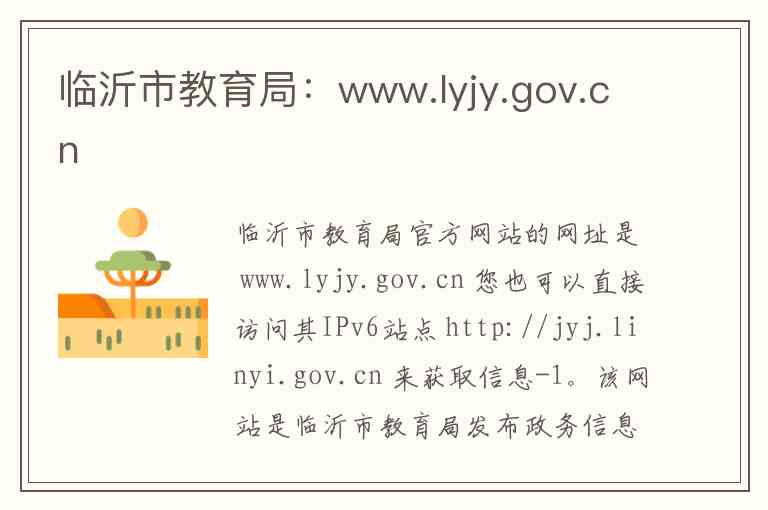 临沂市教育局官方网站的网址是 www.lyjy.gov.cn 您也可以直接访问其IPv6站点 http://jyj.linyi.gov.cn 来获取信息-1。该网站是临沂市教育局发布政务信息、提供教育服务和与公众互动交流的官方网络平台,其内容和服务丰富全面,主要分为以下几个方面