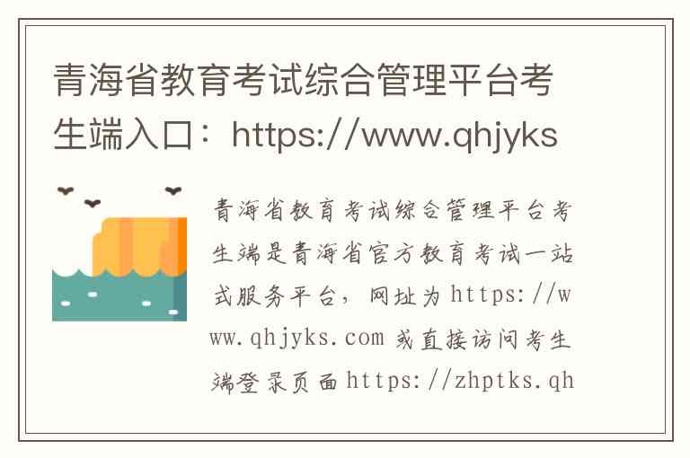 青海省教育考试综合管理平台考生端是青海省官方教育考试一站式服务平台,网址为 https://www.qhjyks.com 或直接访问考生端登录页面 https://zhptks.qhjyks.com/student -1-3。该平台由青海省教育招生考试院主办,覆盖普通高考、研究生考试、自学考试、成Ren高考、学业水平考试及社会考试等全类型考试,提供全流程服务。考生可通过平台进行网上报名缴费、打印准考证、查询成绩、填报志愿、查询录取结果,并完成资格申请如加分和专项计划等-1-4-7。平台的主要功能模块包括数字招考服务大厅综合管理平台入口,具体操作依据各类考试指南进行-1-4。