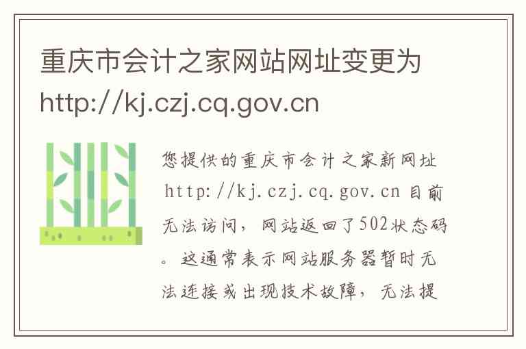 您提供的重庆市会计之家新网址 http://kj.czj.cq.gov.cn 目前无法访问,网站返回了502状态码。这通常表示网站服务器暂时无法连接或出现技术故障,无法提供正常的内容和服务。