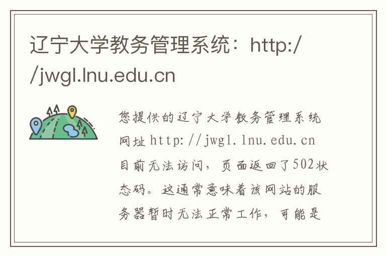 您提供的辽宁大学教务管理系统网址 http://jwgl.lnu.edu.cn 目前无法访问,页面返回了502状态码。这通常意味着该网站的服务器暂时无法正常工作,可能是由于系统维护、访问量过大或网络问题导致的暂时性故障,建议您稍后再尝试访问。