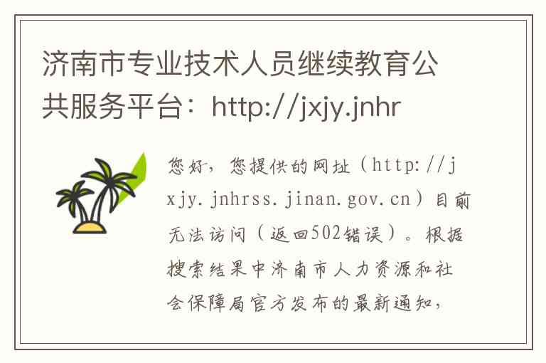 您好,您提供的网址(http://jxjy.jnhrss.jinan.gov.cn)目前无法访问(返回502错误)。根据搜索结果中济南市人力资源和社会保障局官方发布的最新通知,该平台目前实际使用的访问地址为:http://221.214.69.254:9090/ -1-8-10。