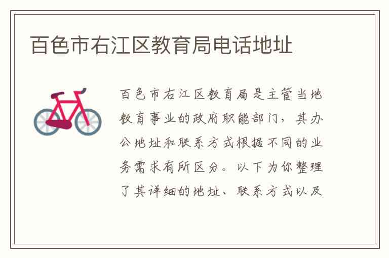 百色市右江区教育局是主管当地教育事业的政府职能部门,其办公地址和联系方式根据不同的业务需求有所区分。以下为你整理了其详细的地址、联系方式以及该局提供的主要服务内容。