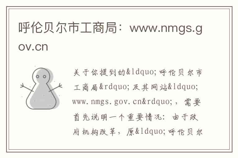 关于你提到的“呼伦贝尔市工商局”及其网站“www.nmgs.gov.cn”,需要首先说明一个重要情况:由于政府机构改革,原“呼伦贝尔市工商行政管理局”的职能已整合进“呼伦贝尔市市场监督管理局”。因此,你提供的网址目前不再是呼伦贝尔市工商管理相关业务的主办网站,所有相关业务和服务均已转移至新的市场监督管理局平台。