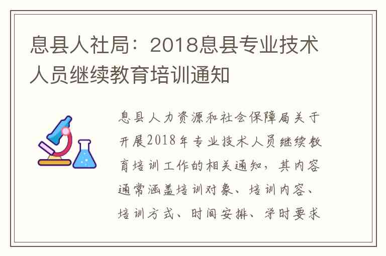 息县人力资源和社会保障局关于开展2018年专业技术人员继续教育培训工作的相关通知,其内容通常涵盖培训对象、培训内容、培训方式、时间安排、学时要求、报名流程及地点等关键信息。以下是基于息县此类常规通知整理的详细内容说明,并提供相关地址与联系方式。由于具体的年度通知会随时间调整,以下信息基于2018年前后的标准模式整理,具体细节请以当年发布的通知原文为准。