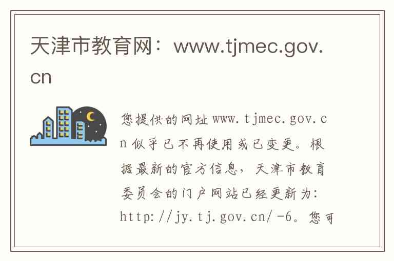 您提供的网址 www.tjmec.gov.cn 似乎已不再使用或已变更。根据最新的官方信息,天津市教育委员会的门户网站已经更新为:http://jy.tj.gov.cn/ -6。