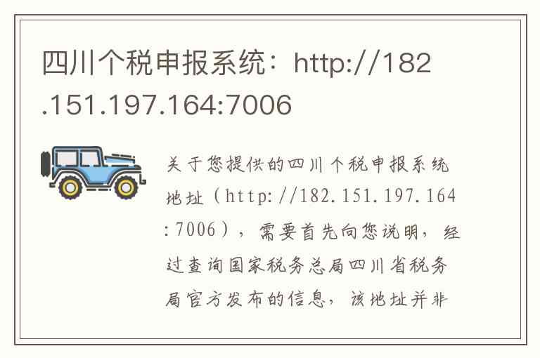 关于您提供的四川个税申报系统地址(http://182.151.197.164:7006),需要首先向您说明,经过查询国家税务总局四川省税务局官方发布的信息,该地址并非四川省个人所得税业务的官方入口。请您务必注意甄别,切勿在非官方网址输入个人隐私信息,以保障您的信息安全。