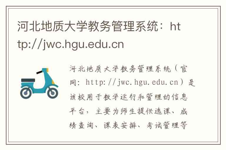 河北地质大学教务管理系统(官网:http://jwc.hgu.edu.cn)是该校用于教学运行和管理的信息平台,主要为师生提供选课、成绩查询、课表安排、考试管理等一系列教学服务。以下从内容服务、地址和联系方式三个方面为您详细介绍。