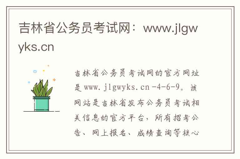 吉林省公务员考试网的官方网址是 www.jlgwyks.cn -4-6-9。该网站是吉林省发布公务员考试相关信息的官方平台,所有招考公告、网上报名、成绩查询等核心工作均在此进行-9。以下是关于该网站的服务内容、地址和联系方式的详细说明。