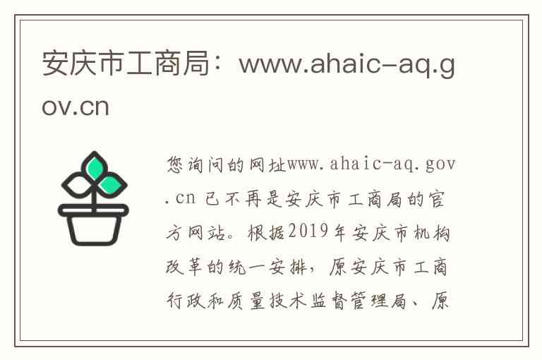您询问的网址www.ahaic-aq.gov.cn 已不再是安庆市工商局的官方网站。根据2019年安庆市机构改革的统一安排,原安庆市工商行政和质量技术监督管理局、原安庆市食品药品监督管理局等部门的职责已整合,组建了安庆市市场监督管理局-2。因此,原工商局的业务和职能现已全部由安庆市市场监督管理局承接。以下为您详细说明现安庆市市场监督管理局官方网站的内容与服务,并提供准确的地址和联系方式。