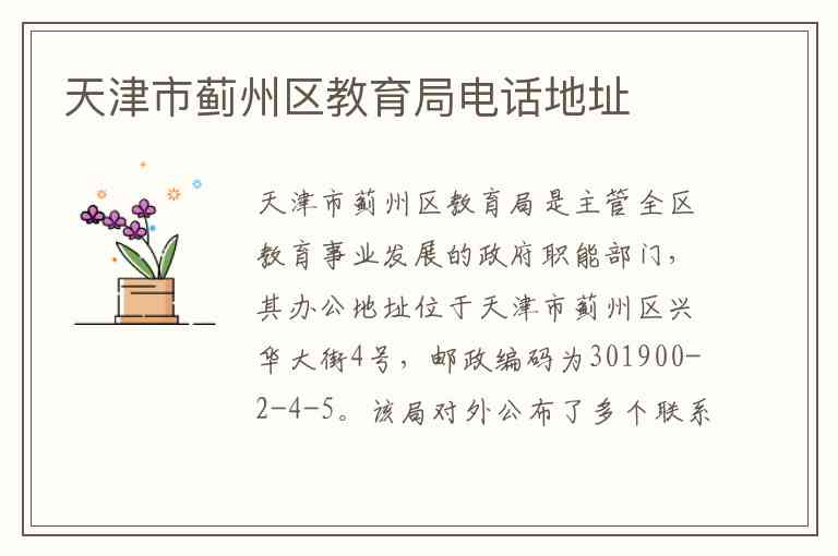天津市蓟州区教育局是主管全区教育事业发展的政府职能部门,其办公地址位于天津市蓟州区兴华大街4号,邮政编码为301900-2-4-5。该局对外公布了多个联系方式以满足不同的业务需求,主要的综合联系电话为022-29141099-2-4。此外,针对特定业务,设有专门的联系渠道,例如民办学校招生简章和广告备案可拨打022-29038075或发送邮件至chengjiaoke2080@163.com进行咨询-6;对学校体育工作的监督检查可拨打022-29140814联系-9;学校食品卫生监督举报电话则为022-29030812-8。