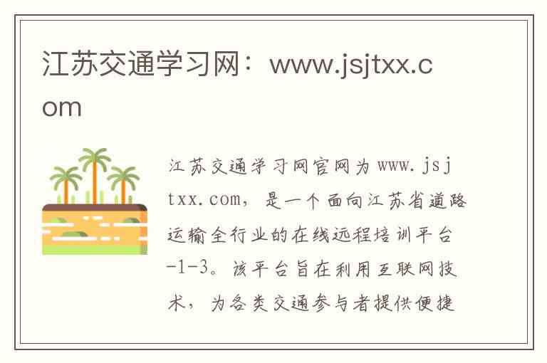 江苏交通学习网官网为 www.jsjtxx.com,是一个面向江苏省道路运输全行业的在线远程培训平台-1-3。该平台旨在利用互联网技术,为各类交通参与者提供便捷、高效的学习服务,有效解决传统集中培训中存在的工学矛盾、师资不足和成本高等问题-6-8。