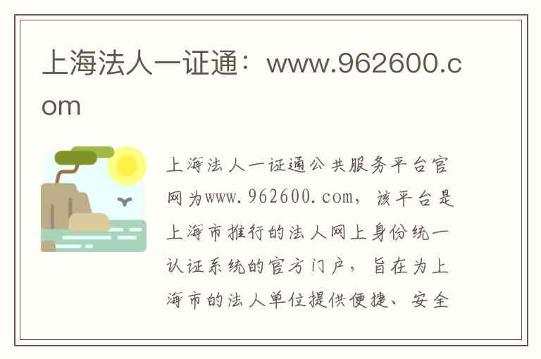上海法人一证通公共服务平台官网为www.962600.com,该平台是上海市推行的法人网上身份统一认证系统的官方门户,旨在为上海市的法人单位提供便捷、安全的网上办事数字身份服务-1-7。