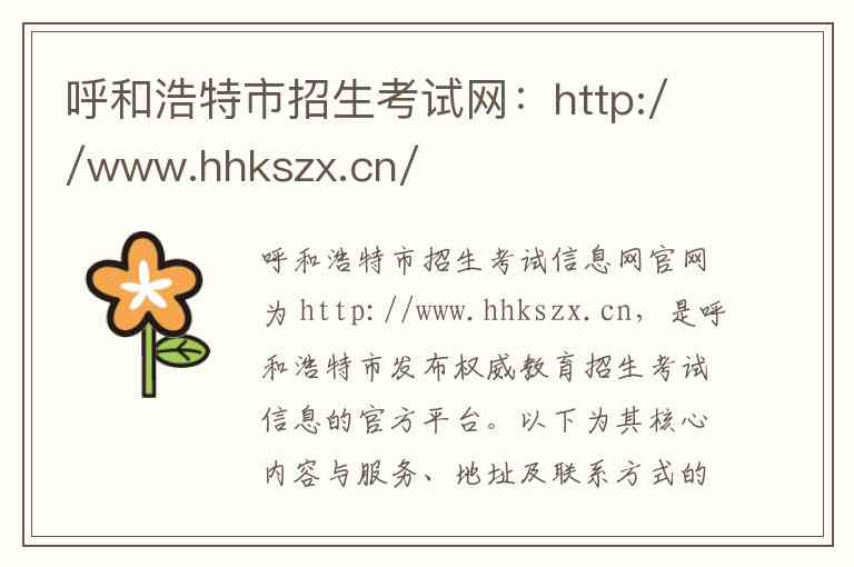 呼和浩特市招生考试信息网官网为 http://www.hhkszx.cn,是呼和浩特市发布权威教育招生考试信息的官方平台。以下为其核心内容与服务、地址及联系方式的详细说明。