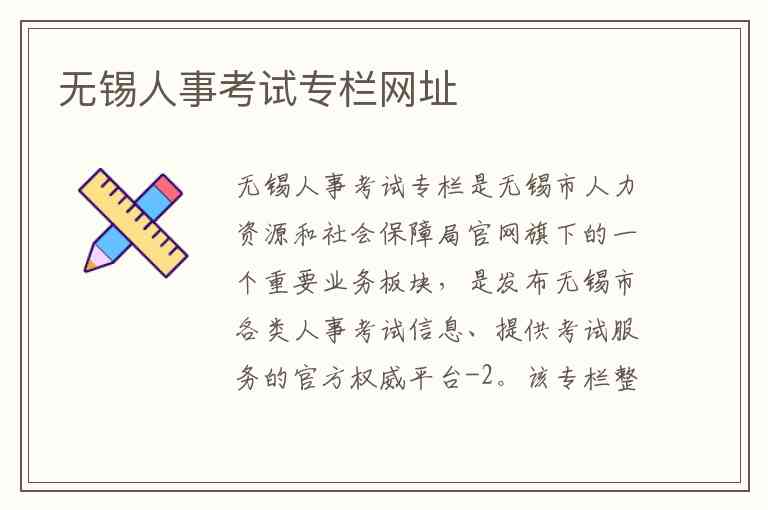 无锡人事考试专栏是无锡市人力资源和社会保障局官网旗下的一个重要业务板块,是发布无锡市各类人事考试信息、提供考试服务的官方权威平台。该专栏整合了原无锡人事考试网的功能,为考生提供一站式服务。