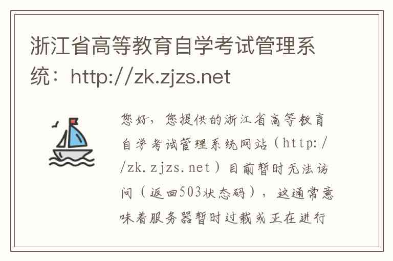 您好,您提供的浙江省高等教育自学考试管理系统网站(http://zk.zjzs.net)目前暂时无法访问(返回503状态码),这通常意味着服务器暂时过载或正在进行维护,建议您稍后再尝试访问。